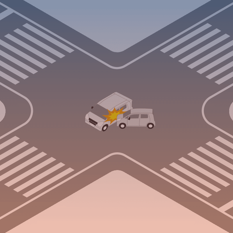 ・イラストに使用している各要素(車、背景、車、天候、信号、衝突地点など)は、代表的なイメージをイラスト化しており、色や形状等含め現実の事故の状況とは異なります。あくまで、事故のイメージとして参考までにご活用ください。