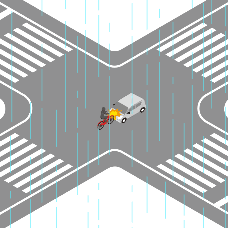 ・イラストに使用している各要素(車、背景、車、天候、信号、衝突地点など)は、代表的なイメージをイラスト化しており、色や形状等含め現実の事故の状況とは異なります。あくまで、事故のイメージとして参考までにご活用ください。