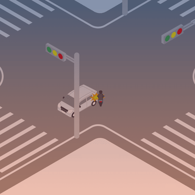 ・イラストに使用している各要素(車、背景、車、天候、信号、衝突地点など)は、代表的なイメージをイラスト化しており、色や形状等含め現実の事故の状況とは異なります。あくまで、事故のイメージとして参考までにご活用ください。