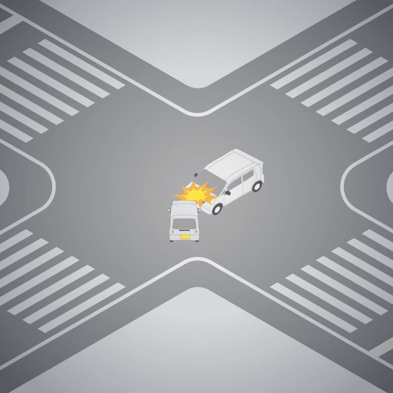 ・イラストに使用している各要素(車、背景、車、天候、信号、衝突地点など)は、代表的なイメージをイラスト化しており、色や形状等含め現実の事故の状況とは異なります。あくまで、事故のイメージとして参考までにご活用ください。