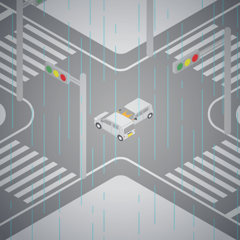 ・イラストに使用している各要素(車、背景、車、天候、信号、衝突地点など)は、代表的なイメージをイラスト化しており、色や形状等含め現実の事故の状況とは異なります。あくまで、事故のイメージとして参考までにご活用ください。