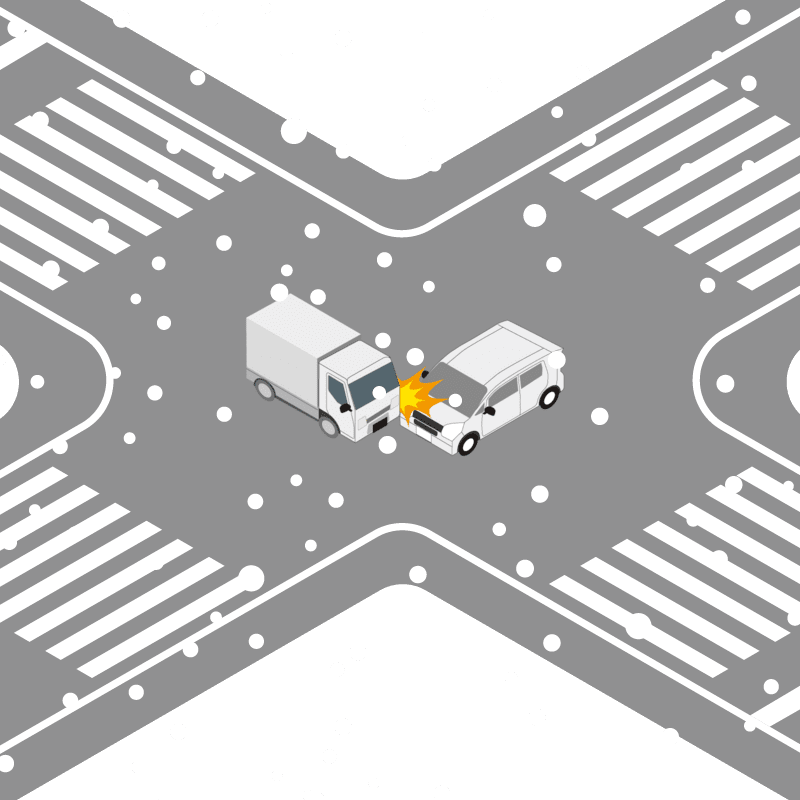 ・イラストに使用している各要素(車、背景、車、天候、信号、衝突地点など)は、代表的なイメージをイラスト化しており、色や形状等含め現実の事故の状況とは異なります。あくまで、事故のイメージとして参考までにご活用ください。