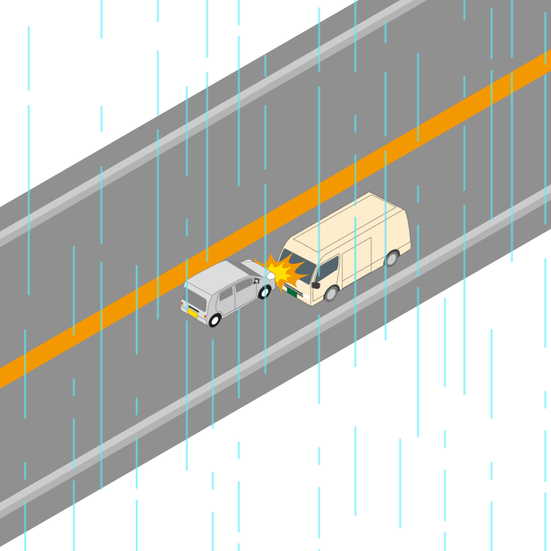 ・イラストに使用している各要素(車、背景、車、天候、信号、衝突地点など)は、代表的なイメージをイラスト化しており、色や形状等含め現実の事故の状況とは異なります。あくまで、事故のイメージとして参考までにご活用ください。