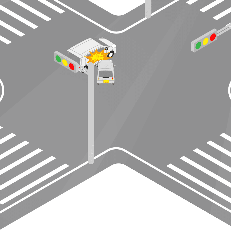 ・イラストに使用している各要素(車、背景、車、天候、信号、衝突地点など)は、代表的なイメージをイラスト化しており、色や形状等含め現実の事故の状況とは異なります。あくまで、事故のイメージとして参考までにご活用ください。