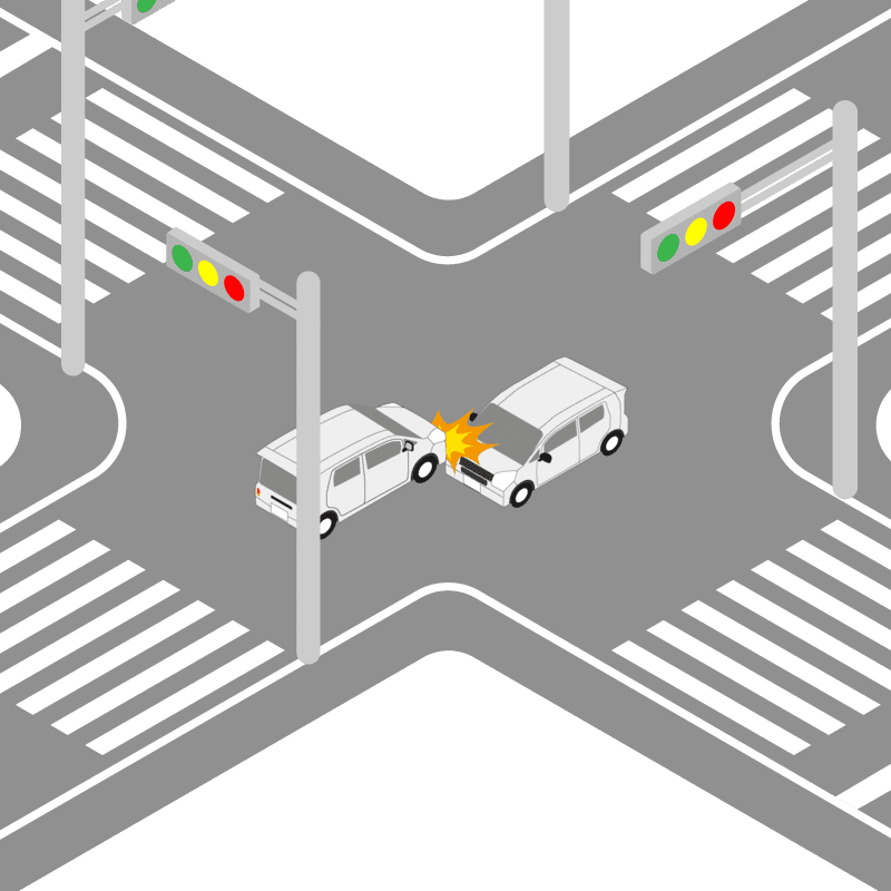 ・イラストに使用している各要素(車、背景、車、天候、信号、衝突地点など)は、代表的なイメージをイラスト化しており、色や形状等含め現実の事故の状況とは異なります。あくまで、事故のイメージとして参考までにご活用ください。