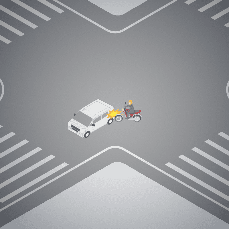 ・イラストに使用している各要素(車、背景、車、天候、信号、衝突地点など)は、代表的なイメージをイラスト化しており、色や形状等含め現実の事故の状況とは異なります。あくまで、事故のイメージとして参考までにご活用ください。