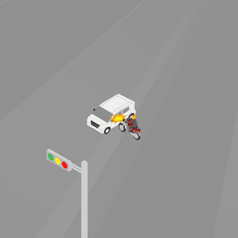 ・イラストに使用している各要素(車、背景、車、天候、信号、衝突地点など)は、代表的なイメージをイラスト化しており、色や形状等含め現実の事故の状況とは異なります。あくまで、事故のイメージとして参考までにご活用ください。