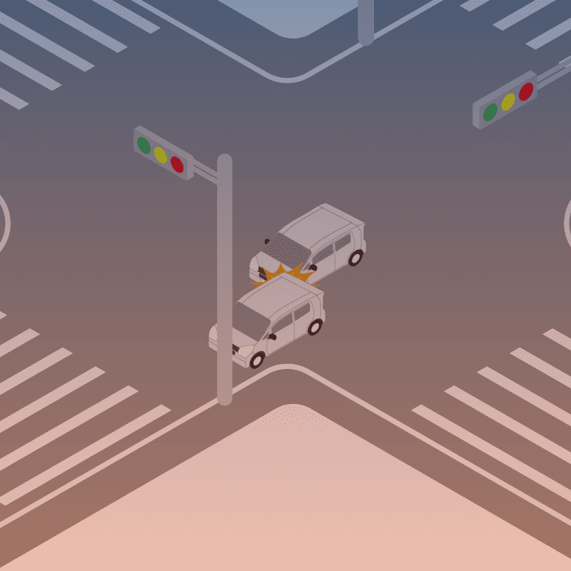 ・イラストに使用している各要素(車、背景、車、天候、信号、衝突地点など)は、代表的なイメージをイラスト化しており、色や形状等含め現実の事故の状況とは異なります。あくまで、事故のイメージとして参考までにご活用ください。
