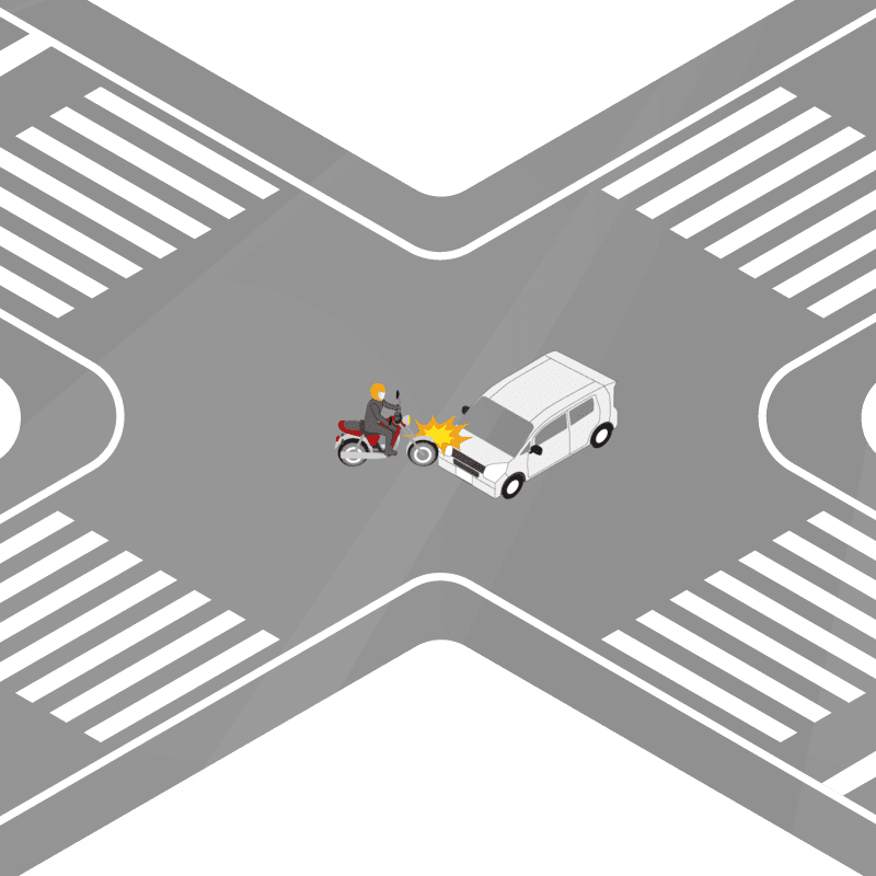 ・イラストに使用している各要素(車、背景、車、天候、信号、衝突地点など)は、代表的なイメージをイラスト化しており、色や形状等含め現実の事故の状況とは異なります。あくまで、事故のイメージとして参考までにご活用ください。