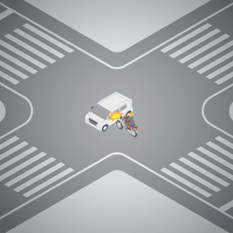 ・イラストに使用している各要素(車、背景、車、天候、信号、衝突地点など)は、代表的なイメージをイラスト化しており、色や形状等含め現実の事故の状況とは異なります。あくまで、事故のイメージとして参考までにご活用ください。