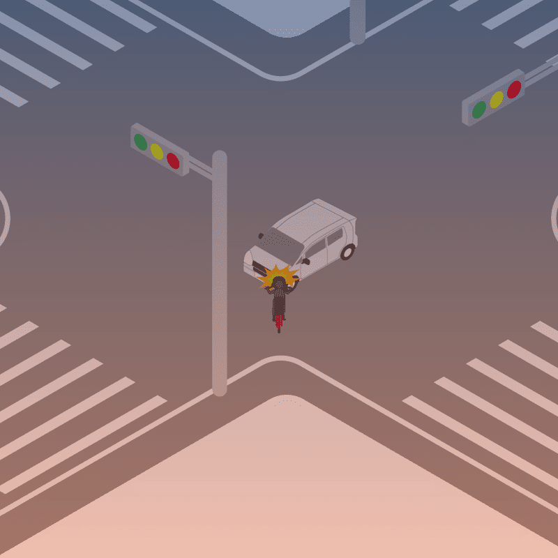 ・イラストに使用している各要素(車、背景、車、天候、信号、衝突地点など)は、代表的なイメージをイラスト化しており、色や形状等含め現実の事故の状況とは異なります。あくまで、事故のイメージとして参考までにご活用ください。