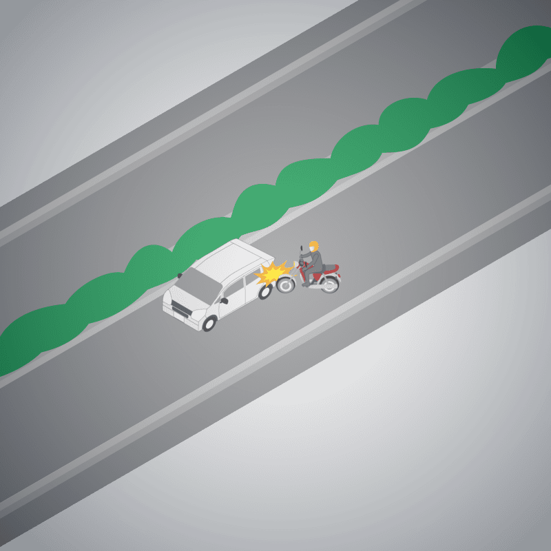 ・イラストに使用している各要素(車、背景、車、天候、信号、衝突地点など)は、代表的なイメージをイラスト化しており、色や形状等含め現実の事故の状況とは異なります。あくまで、事故のイメージとして参考までにご活用ください。