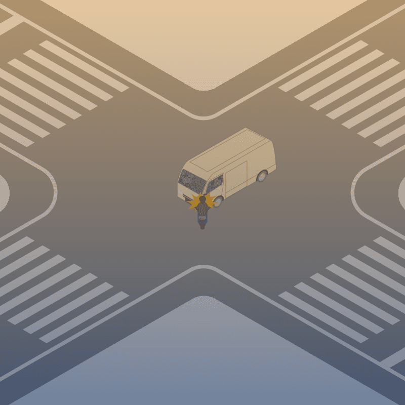 ・イラストに使用している各要素(車、背景、車、天候、信号、衝突地点など)は、代表的なイメージをイラスト化しており、色や形状等含め現実の事故の状況とは異なります。あくまで、事故のイメージとして参考までにご活用ください。