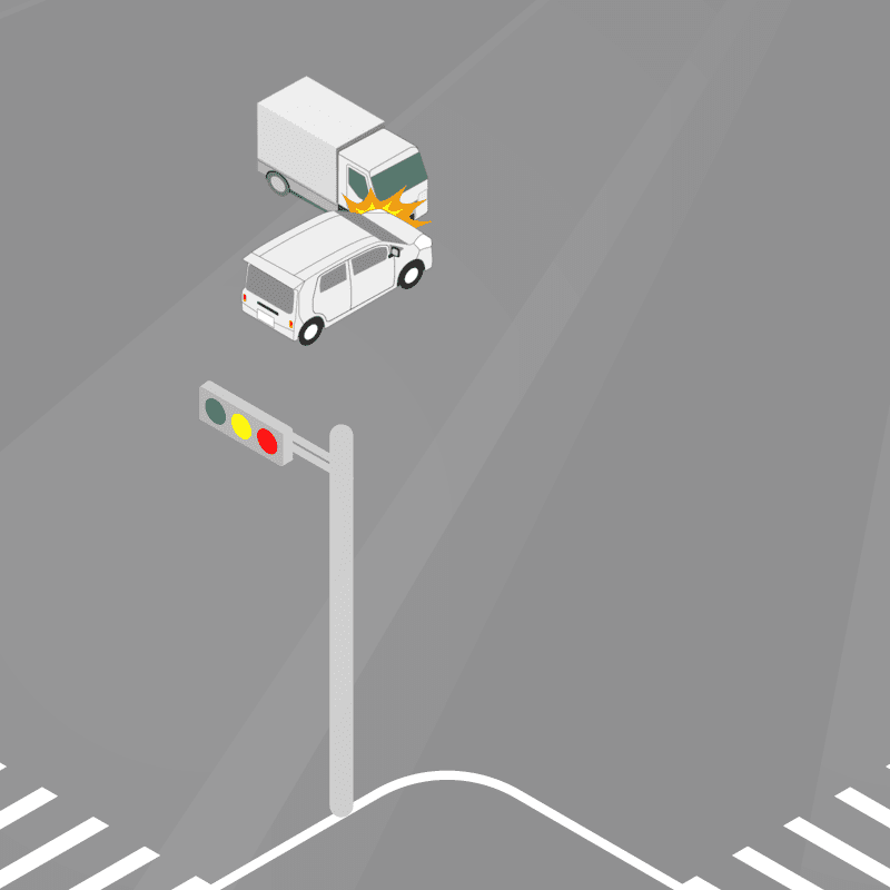 ・イラストに使用している各要素(車、背景、車、天候、信号、衝突地点など)は、代表的なイメージをイラスト化しており、色や形状等含め現実の事故の状況とは異なります。あくまで、事故のイメージとして参考までにご活用ください。