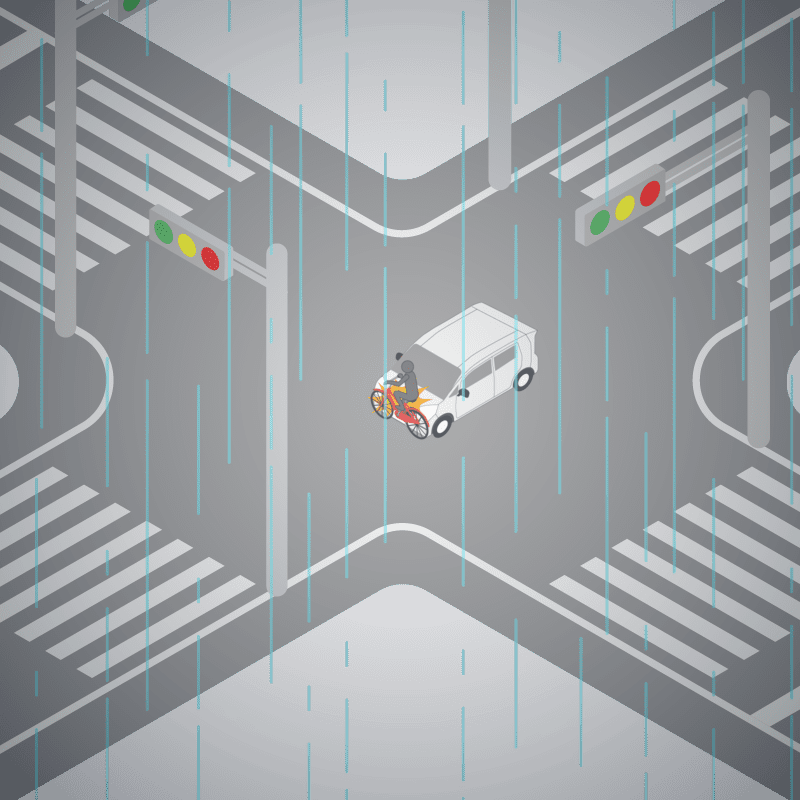 ・イラストに使用している各要素(車、背景、車、天候、信号、衝突地点など)は、代表的なイメージをイラスト化しており、色や形状等含め現実の事故の状況とは異なります。あくまで、事故のイメージとして参考までにご活用ください。