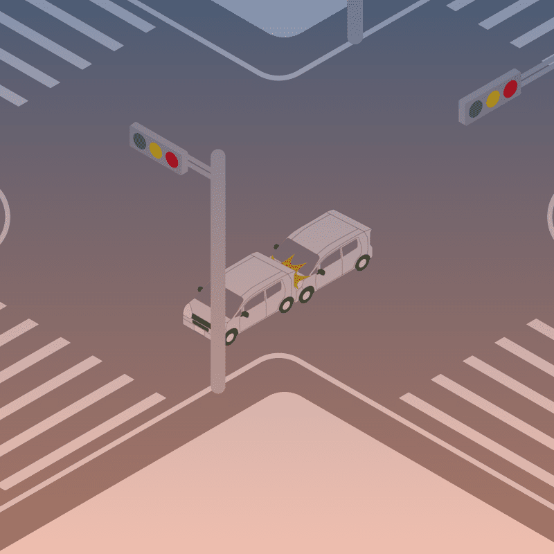 ・イラストに使用している各要素(車、背景、車、天候、信号、衝突地点など)は、代表的なイメージをイラスト化しており、色や形状等含め現実の事故の状況とは異なります。あくまで、事故のイメージとして参考までにご活用ください。