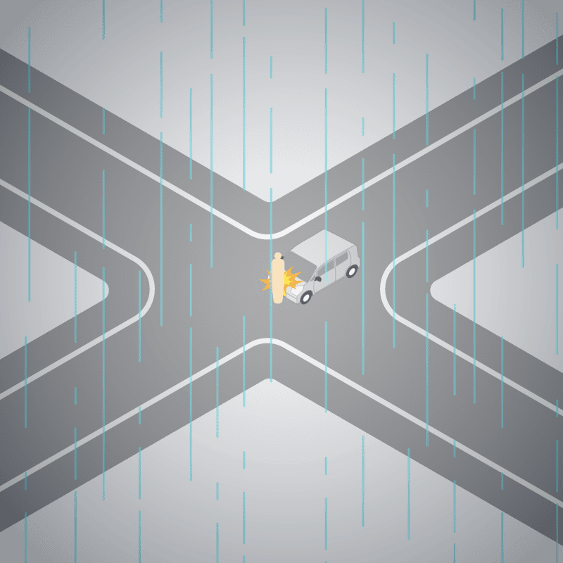 ・イラストに使用している各要素(車、背景、車、天候、信号、衝突地点など)は、代表的なイメージをイラスト化しており、色や形状等含め現実の事故の状況とは異なります。あくまで、事故のイメージとして参考までにご活用ください。
