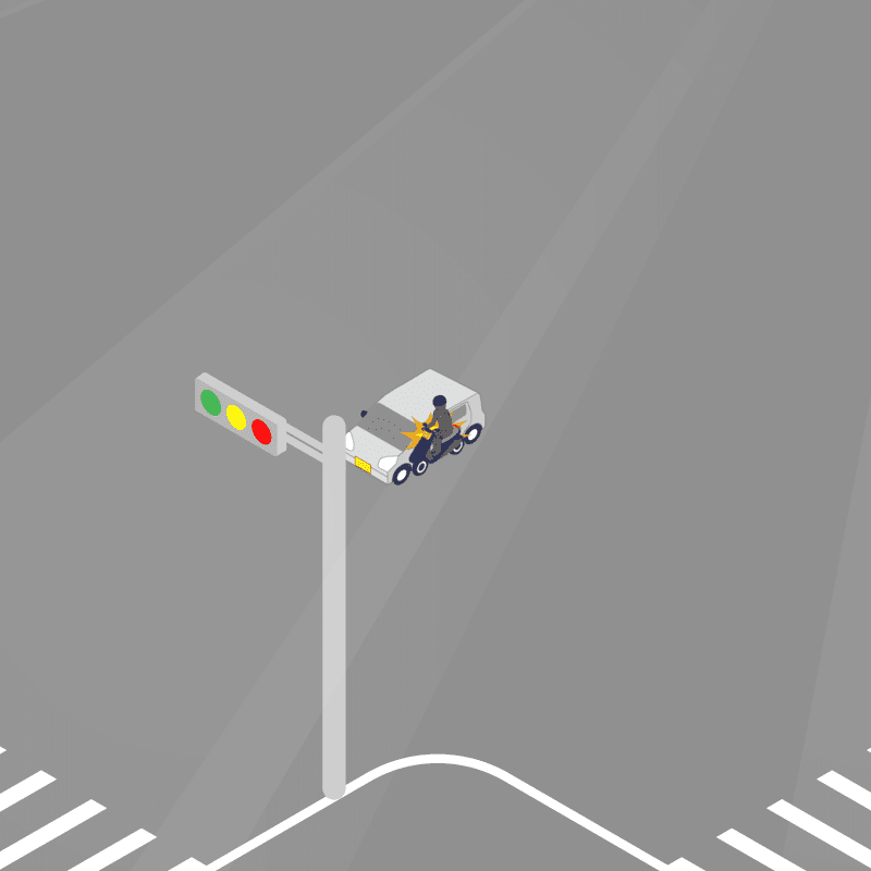 ・イラストに使用している各要素(車、背景、車、天候、信号、衝突地点など)は、代表的なイメージをイラスト化しており、色や形状等含め現実の事故の状況とは異なります。あくまで、事故のイメージとして参考までにご活用ください。