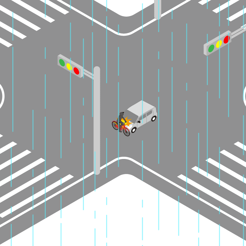 ・イラストに使用している各要素(車、背景、車、天候、信号、衝突地点など)は、代表的なイメージをイラスト化しており、色や形状等含め現実の事故の状況とは異なります。あくまで、事故のイメージとして参考までにご活用ください。