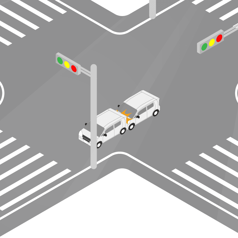 ・イラストに使用している各要素(車、背景、車、天候、信号、衝突地点など)は、代表的なイメージをイラスト化しており、色や形状等含め現実の事故の状況とは異なります。あくまで、事故のイメージとして参考までにご活用ください。