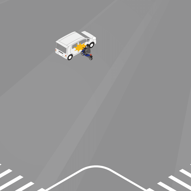 ・イラストに使用している各要素(車、背景、車、天候、信号、衝突地点など)は、代表的なイメージをイラスト化しており、色や形状等含め現実の事故の状況とは異なります。あくまで、事故のイメージとして参考までにご活用ください。