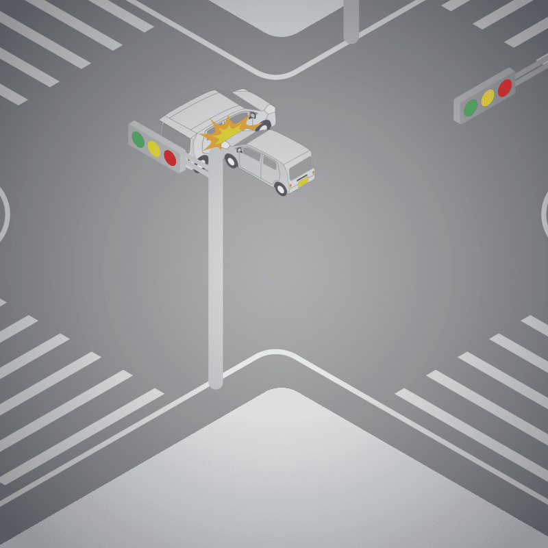 ・イラストに使用している各要素(車、背景、車、天候、信号、衝突地点など)は、代表的なイメージをイラスト化しており、色や形状等含め現実の事故の状況とは異なります。あくまで、事故のイメージとして参考までにご活用ください。